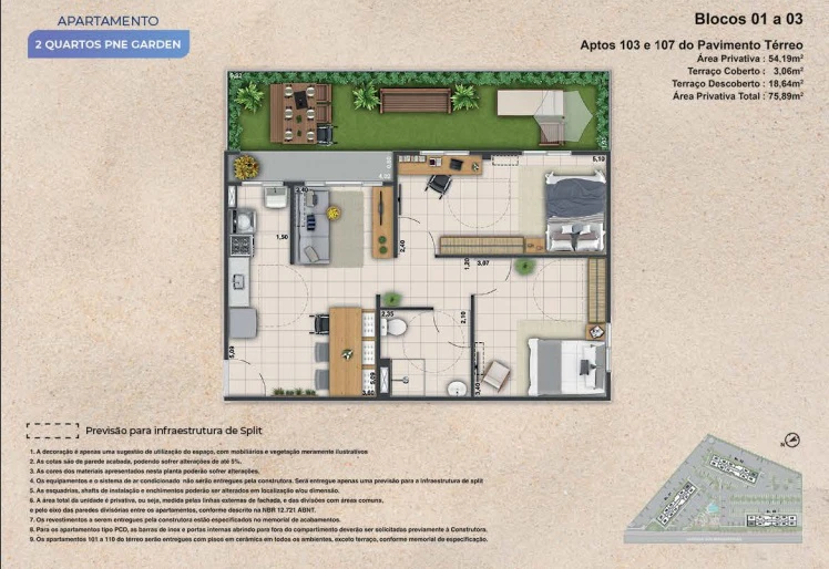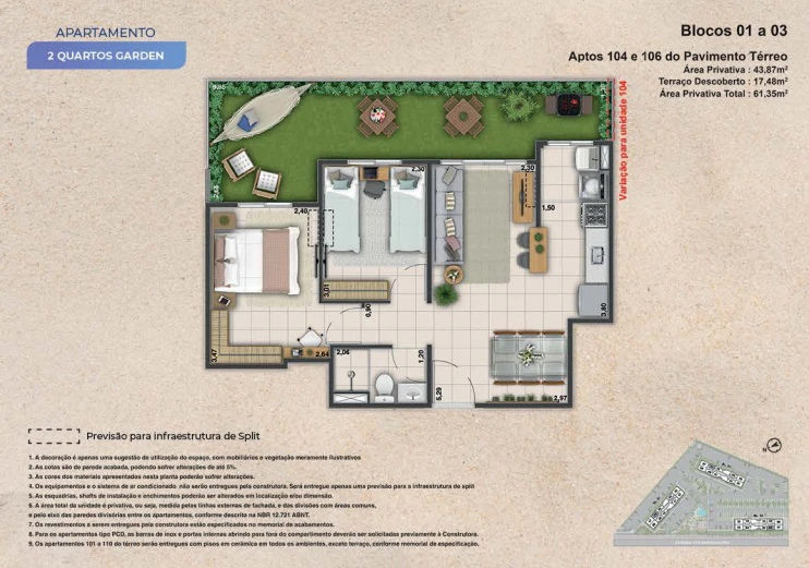 Apartamentos de 2 Garden com 61m² até 75m².
