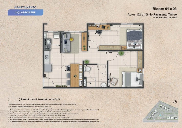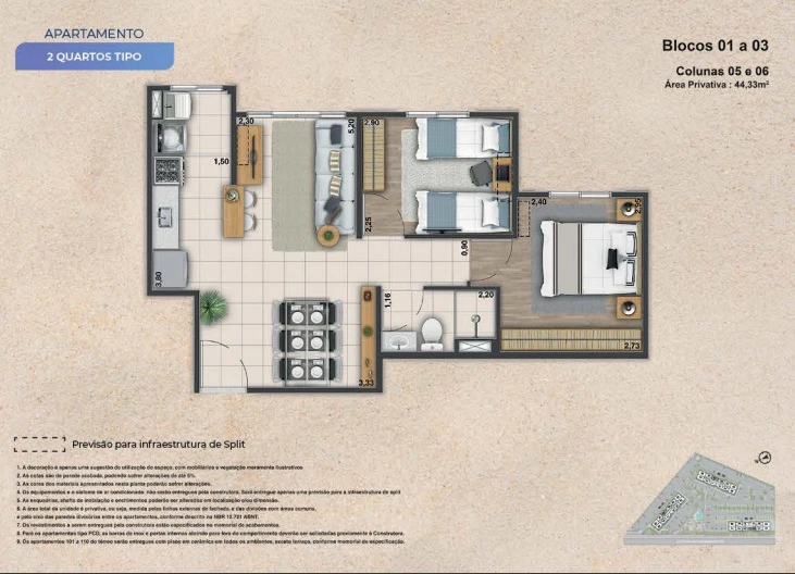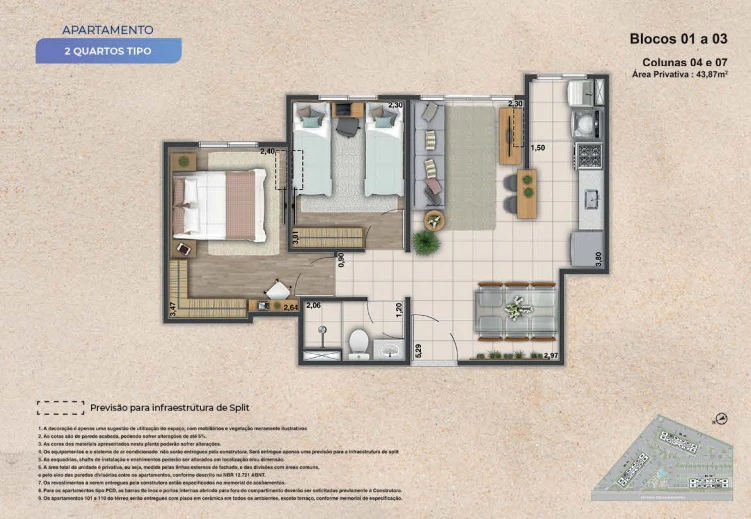 Apartamentos de 2 quartos com 43m² até 44m².