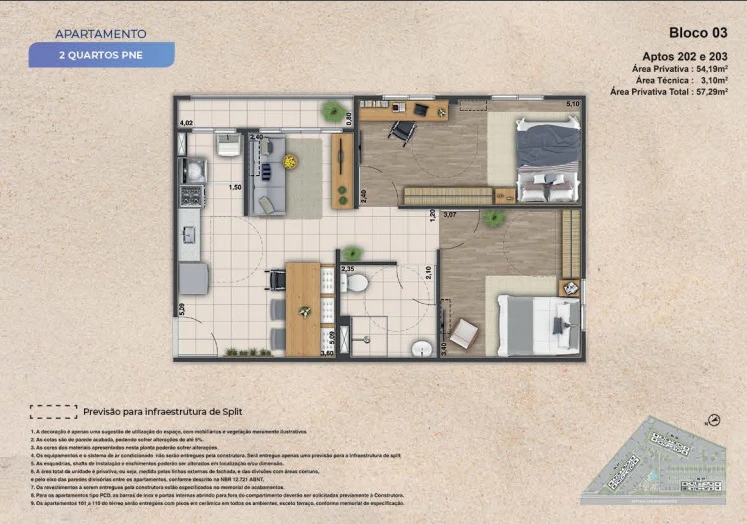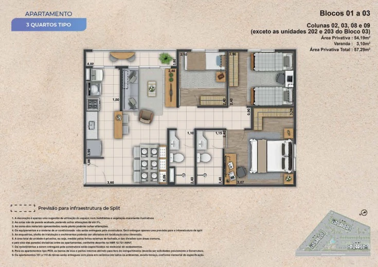 Apartamentos de 3 quartos com 57m².